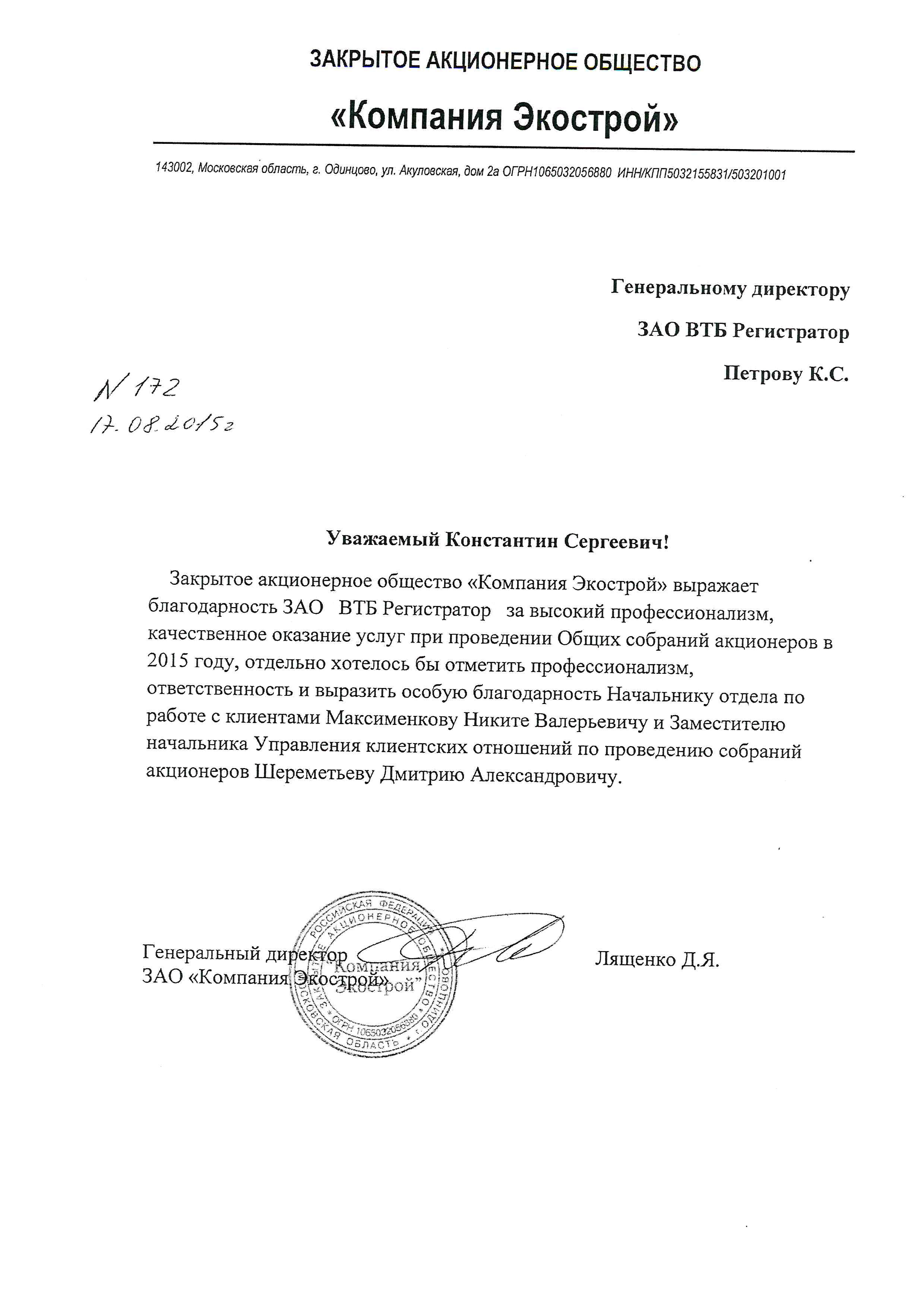 17 августа 2015 г. Уважаемый Константин Сергеевич!Закрытое акционерное общество "Компания Экострой" выражает благодарность ЗАО ВТБ Регистратор за высокий профессионализм, качественное оказание услуг при проведении Общих собраний акционеров в 2015 году, отдельно хотелось бы отметить профессионализм, ответственность и выразить особую благодрарность Начальнику отдела по работе с клиентами Максименкову Никите Валерьевичу и Заместителю начальника Управления клиентских отношений по проведению собраний акционеров Шереметьеву Дмитрию Александровичу.